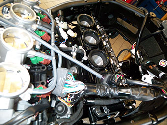Zunächst zerlegen wir den Motor, vermessen alle relevanten Bauteile und reinigen das Triebwerk gründlich, wozu auch das Glasstrahlen der Ventile gehört. Anschließend erfolgt das Tuning von Meisterhand: Kanäle des Zylinderkopfs vergrößern, strömungsgünstig fräsen und glätten (Superflow-Bench-Tested); Brennräume modifizieren und alle vier Brennräume auf gleiches Maß auslitern; Ventilsitze von innen weiter nach außen drehen und auf exakte Sitzbreite fräsen; Spaltmaße zwischen den Kolbenböden und Brennräumen ändern, Zylinderkopf komplettieren, erneut exakt auslitern und die Verdichtung minimal erhöhen; Steuerzeiten der Nockenwellen auf größere Ventilüberschneidung einstellen und Ventilspiele präzise auf LKM Maß ändern. Es folgen Einstellarbeiten an der Einspritzanlage, der Airbox und der Zündung. Nach der Fertigstellung des Motors führen wir eine komplette Inspektion am Motorrad und eine weitere Leistungsmessung durch.